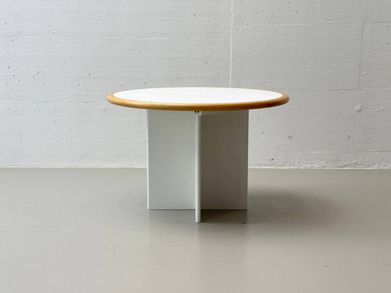 Questo tavolo ha un design moderno con una superficie bianca liscia. È inoltre incorniciato da un caldo bordo in legno marrone chiaro.