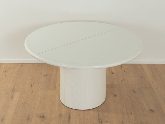 Tavolo da pranzo allungabile postmoderno degli anni '80. Struttura di alta qualità con base rotonda in frassino tinto bianco, piano bianco con rivestimento in plastica con leggere venature, bordi in legno massello tinto bianco e un'allunga. Prodotto in Germania. Larghezza estesa 178 cm. Rif. 2402047