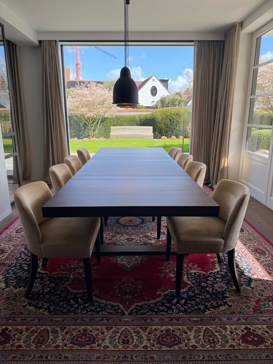 Tavolo da pranzo su misura in legno di macassar abbinato a 8 sedie e tappeto iraniano coordinato.