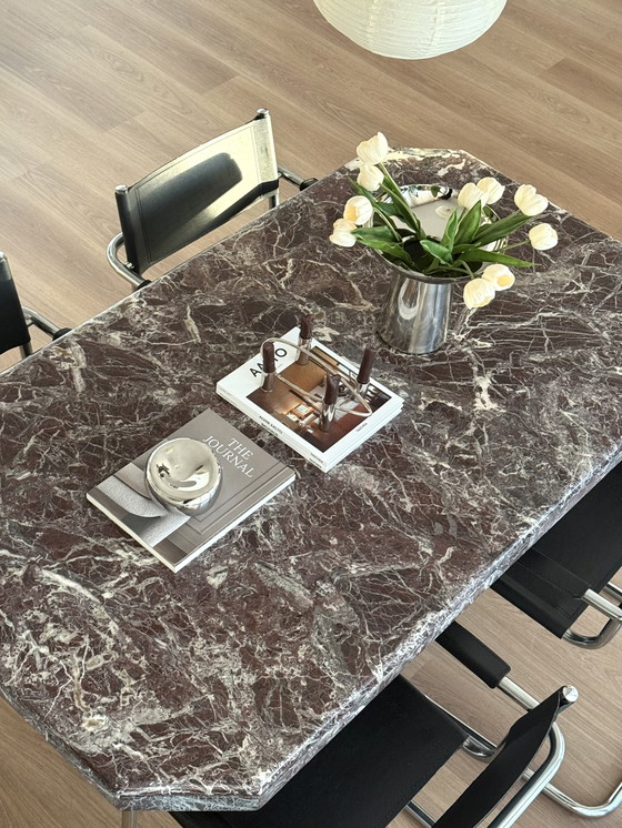 Questo tavolo da pranzo vintage eccezionalmente raro in marmo Rosso Levanto è un pezzo unico che si distingue per il suo colore unico e le sue venature sorprendenti.