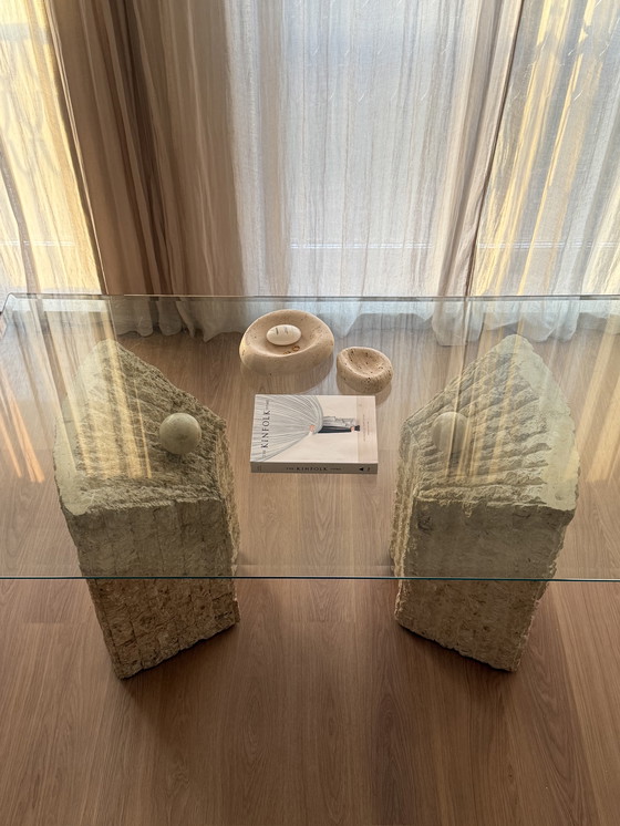 Vintage metà secolo italiano moderno artigianale modernista postmoderno era spaziale travertino marmo marmo pietra naturale pietra pietra tavolo da salotto tavolino da caffè tavolo da salotto design retrò antico tavolino da caffè vintage interni interior design styling interior styling tavolino scultoreo metà secolo metà secolo Japandi wabi sabi wabisabi minimalista danese svedese scandinavo design moderno mcm metà secolo moderno mactanstone mactan pietra vetro bicchieri antico, pietra mactan, fossile, fossile