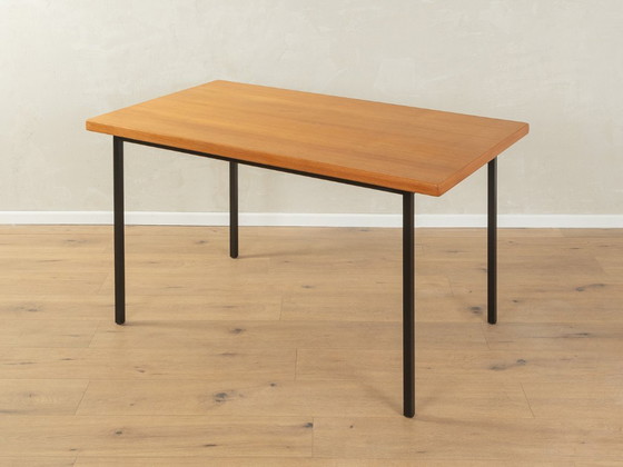 Tavolo da pranzo classico degli anni '60. Struttura in acciaio squadrato laccato nero con piano impiallacciato in teak. Buone condizioni, restaurato con lievi segni di usura. Prodotto in Germania.