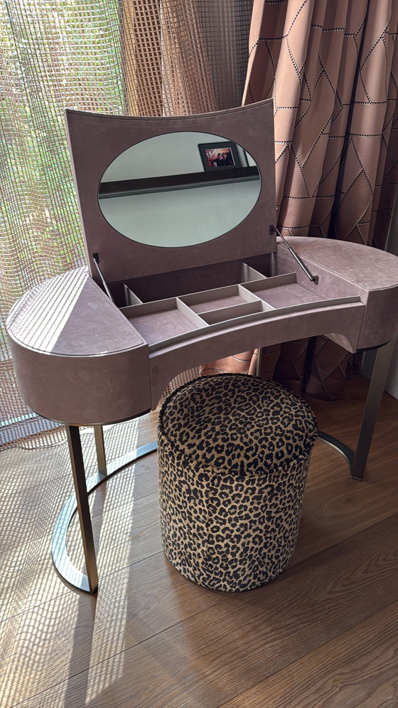 Baxter, Design Roberto Lazzeroni Lunghezza 110 cm Larghezza 54 cm Altezza 77 cm Materiale Struttura: metallo, disponibile in tre colori Piano superiore: metallo, rivestito in pelle L'articolo è stato acquistato da Edha Interieur (Willemsparkweg, Amsterdam) Il prezzo nuovo è di 7.000 euro