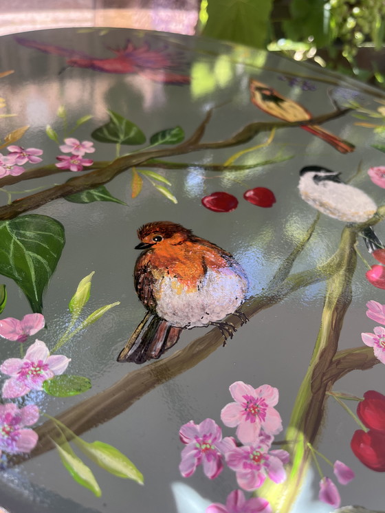 Questo bellissimo tavolo dipinto a mano è un pezzo unico che illuminerà qualsiasi stanza. Il piano del tavolo è decorato con immagini dettagliate di uccelli e fiori, che gli conferiscono un aspetto vibrante e artistico. La robusta base in metallo assicura stabilità e durata. Perfetto sia per l'interno che per l'esterno, questo tavolo è un vero e proprio richiamo visivo in qualsiasi ambiente.