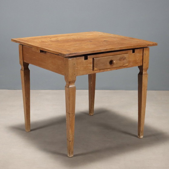 Tavolo direttorio in olmo. Piano quadrato con coppia di allunghe estraibili sotto piano, gambe tronco piramidali. Italia, fine XVIII secolo. Cod.: ANTATA0305220