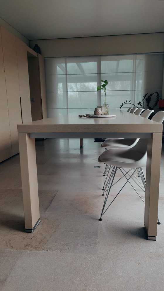 Questo imponente tavolo da pranzo in legno impiallacciato offre un aspetto elegante e moderno che si adatta perfettamente a qualsiasi sala da pranzo. Con una lunghezza generosa di 3,04 metri, è ideale per grandi riunioni e offre ampio spazio per tutti i vostri ospiti.