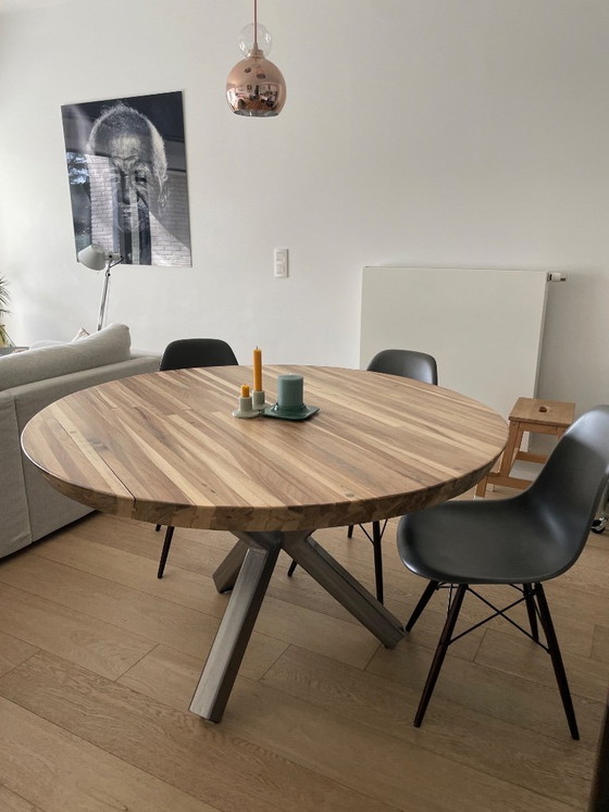 Tavolo di 1,26 m di diametro e 75 cm di altezza. Realizzato artigianalmente, è composto da un piano in legno massello ricavato da una pista da bowling riciclata e da una base in acciaio.