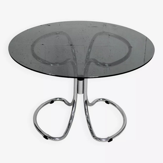 Dimensioni: H73 x L120 x P120 Colore: Argento Materiali: Metallo Stile: Design Tavolo in stile Gastone Rinaldi, Italia, circa 1970. Acciaio cromato e piano in vetro fumé. Lievi graffi dovuti all'uso e corrosione della cromatura, vedi foto. In buone condizioni. Design Space Age.