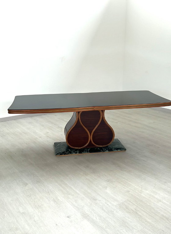 Questo raffinato tavolo Art Deco, con dimensioni di 79 x 217 x 100 cm, è un pezzo d'eccezione che unisce eleganza e originalità. Realizzato in legno, presenta un piano in vetro nero che conferisce un contrasto elegante e moderno, mettendo in risalto la base unica e particolarmente curvata. La base, dal design sinuoso e dinamico, è completata con una base in marmo verde, che aggiunge un tocco di lusso e un accento di raffinatezza alla struttura complessiva.