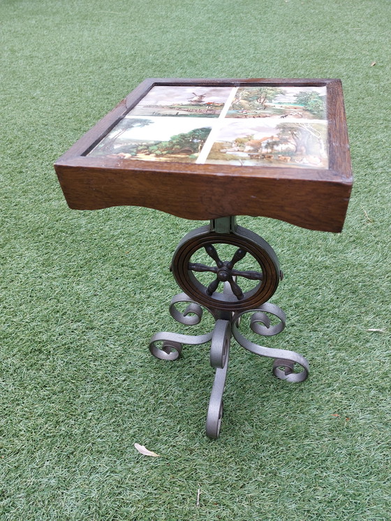 Questo bellissimo tavolino o tavolino per piante in stile Art Déco è un'aggiunta unica a qualsiasi interno. Il piano del tavolo è decorato con piastrelle di ceramica colorate che raffigurano diversi paesaggi, circondate da un'elegante struttura in legno. Le gambe in metallo sono disegnate ad arte con riccioli, che aggiungono il classico look Art Déco. Perfetto per esporre piante o come tavolino decorativo.
