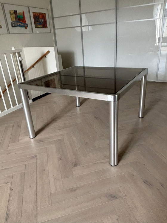 Questo tavolo quadrato (120 x 120) di Artifort, disegnato da Kho Liang Li, è un bellissimo esempio di design moderno. Il tavolo ha un'elegante struttura in alluminio con un piano in vetro fumé, che gli conferisce un aspetto elegante e contemporaneo. Il piano è libero nel bordo e può essere sostituito se necessario. Perfetto per una sala da pranzo moderna o per un ufficio. Il tavolo offre spazio sufficiente per quattro-sei persone ed è un'aggiunta elegante a qualsiasi interno. Le gambe e la struttura in alluminio sono integre. Il piano in vetro presenta segni d'uso (graffi) adeguati all'età del tavolo. Un vero pezzo di design anni '70. Le sedie non fanno parte del tavolo ma possono essere acquistate separatamente.