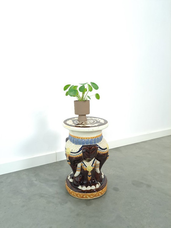 Tavolo rotondo vintage in ceramica con elefanti. Questo tavolo in porcellana proviene dalla Francia ed è perfetto come tavolino o portavasi. È in buone condizioni, con segni di usura coerenti con la sua età. Presenta due fori rotondi sul lato. Il tavolo oscilla leggermente. Dimensioni: Diametro: 30 cm, Altezza: 48 cm