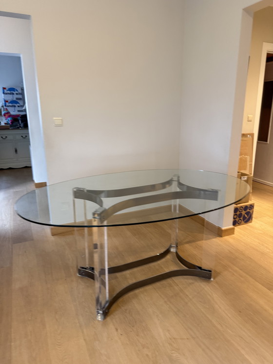 Questo squisito tavolo da pranzo vintage di Alessandro Albrizzi è un esempio di eleganza senza tempo e design sofisticato. Il piano in vetro trasparente è elegantemente sostenuto da una robusta base in plexiglass e metallo, creando un'armoniosa combinazione di materiali che trasuda modernità e classe.