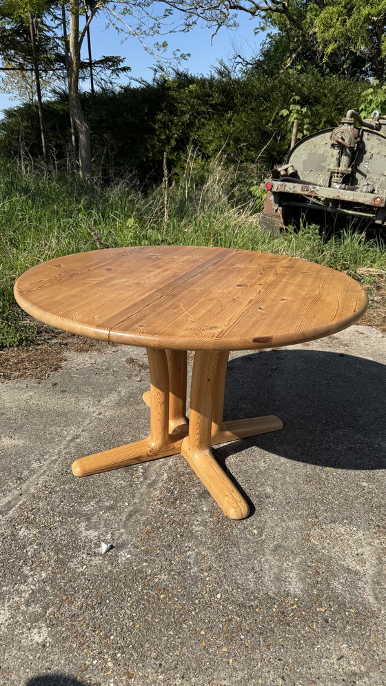 Tavolo Dyrlund XXL in pino, rotondo 120 cm. Con due ripiani intermedi da 50 cm ciascuno. Il tavolo può essere esteso fino a 220 cm x 120 cm, diventando così un tavolo da pranzo molto grande. Realizzato in pino. Il pino è un legno piuttosto tenero, quindi presenta sempre qualche ammaccatura e graffio.