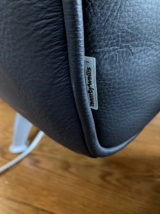 Divano a 3 posti di Team by Wellis. Questo divano è in pelle blu/grigia ed è in buone condizioni nonostante l'uso. È leggermente curvo e misura 183 cm nella parte posteriore e 145 cm nella parte anteriore. Non è mai entrato in contatto con animali domestici, fumatori o bambini.