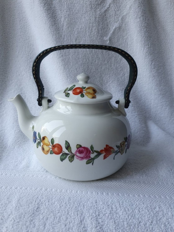 Teiera Porcelaine de Paris, "Décor les four saisons" (Decorazione Quattro Stagioni). Decorata con frutta e fiori. Altezza: 14 cm senza manico, 18 cm con manico.