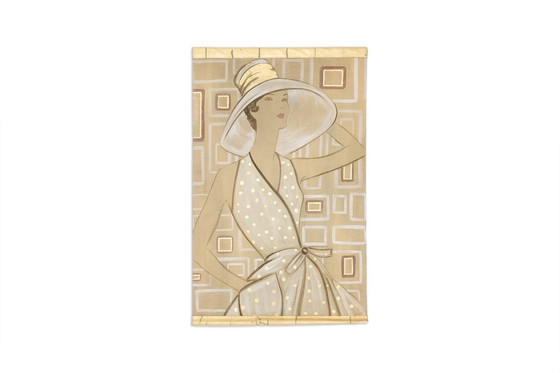 Tela dipinta color crema raffigurante un'elegante donna in stile anni '50 con un cappello a mantella e un abito a trapezio o marquise su uno sfondo geometrico. Opera di artisti francesi contemporanei. Dimensioni: H 160 x L 100 cm Riferimento: LS6135675T Abbiamo un'altra tela che può essere utilizzata per realizzarne una coppia! Tela di lino grezzo dipinta a mano con pigmenti naturali e motivi dorati realizzati con foglia di rame. Tela tesa tramite due aste di legno, di cui quella inferiore rimovibile, che consente di arrotolarla per il trasporto.