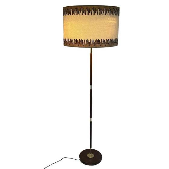 Temde Leuchten - Floor lamp - Space age design - Brass and teak wooden base - fabric covered shade - ca. 1960’s