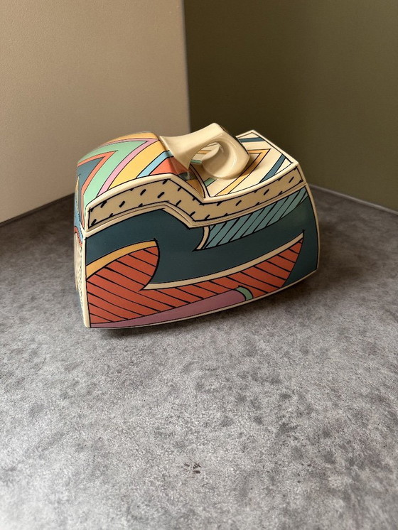 Zuppiera rettangolare con coperchio a zigzag decorato con colori vivaci. Appartenente all'iconica linea di stoviglie Flash, disegnata da Dorothy Hafner negli anni '80 e prodotta dalla rinomata manifattura Rosenthal in Germania. Contrassegnata con il marchio della fabbrica e la scritta Hafner.