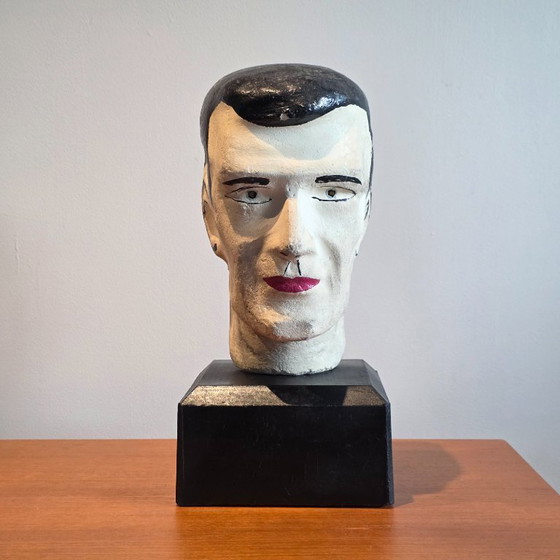 Una scultura vintage unica e di carattere: questa espressiva testa è realizzata in gesso e montata su una pesante base in cemento. La combinazione di materiali grezzi e il design minimalista, quasi modernista, la rendono un vero e proprio elemento di spicco in qualsiasi ambiente.