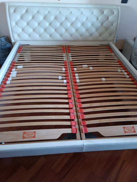 testata imbottita letto matrimoniale in vera pelle bianco panna originale Poltrona Frau lunghezza 2 metri e 37 cm, lato fine letto larghezza 180cm, lato testa 200 cm.