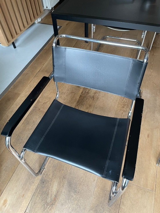 Cuoio nero, base cromata (acciaio inossidabile), braccioli in faggio, laccatura nera (danneggiata, vedi foto), piedini neri. La seduta di una sedia è strappata nella parte inferiore. Originale. Usata frequentemente, vedi foto.