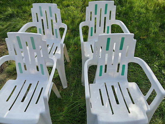 Henry Massonet, 4 sedie da giardino in plastica bianca e verde, in buone condizioni.