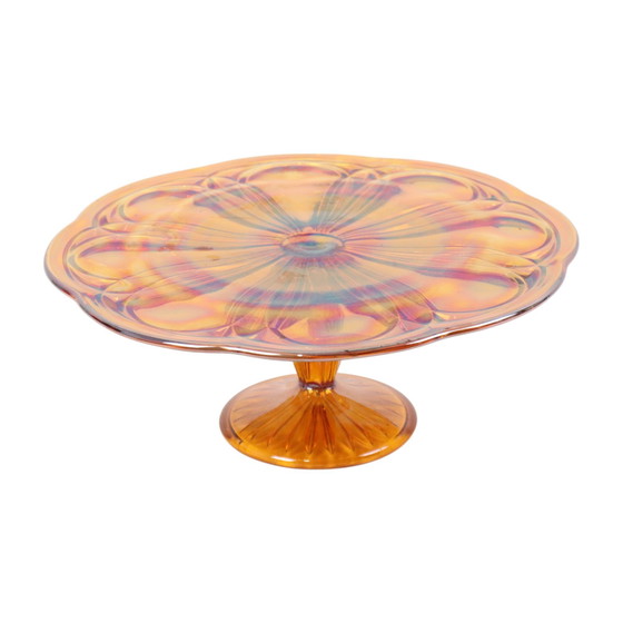 Alzata per torta Art Déco in vetro arancione con effetto madreperla, piatto rotondo per torta con motivo ondulato molto decorativo e motivo a stella sulla base rotonda, in vetro pressato, chiamato anche Depression Glass, raro in questa versione madreperla, senza marchio, probabilmente belga, prima metà del XX secolo. In condizioni vintage quasi perfette, questo oggetto non presenta crepe o rotture ma contiene piccoli fili di vetro e bolle d'aria causati dal processo di produzione, tipici del Depression Glass (non si tratta di danni), minimi graffi superficiali sulla parte superiore, ma nulla di fastidioso, controlla le foto per maggiori dettagli! Dimensioni: diametro 33 cm, altezza 13 cm. Peso: 1,845 kg.