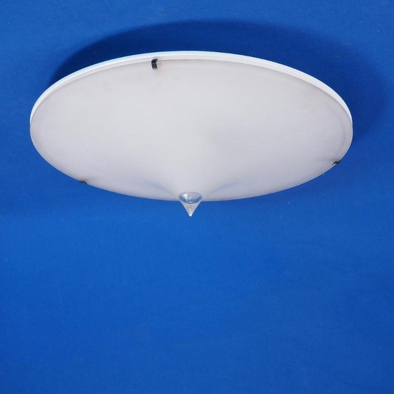 Alien è un progetto di Luciano Cesaro per Tre Ci Luce del 1985. Sebbene originariamente pensata come lampada da soffitto, è più interessante utilizzarla come lampada da parete. L'intrigante forma del paralume in vetro, che si assottiglia a punta, può essere ammirata nei dettagli. La lampada è in ottime condizioni e ha un attacco R7s, per il quale sono disponibili sia versioni alogene che LED, con o senza opzioni dimmerabili. Il paralume in vetro è fissato alla piastra del soffitto con tre clip. La lampada misura 36 cm di diametro e 13 cm di altezza.