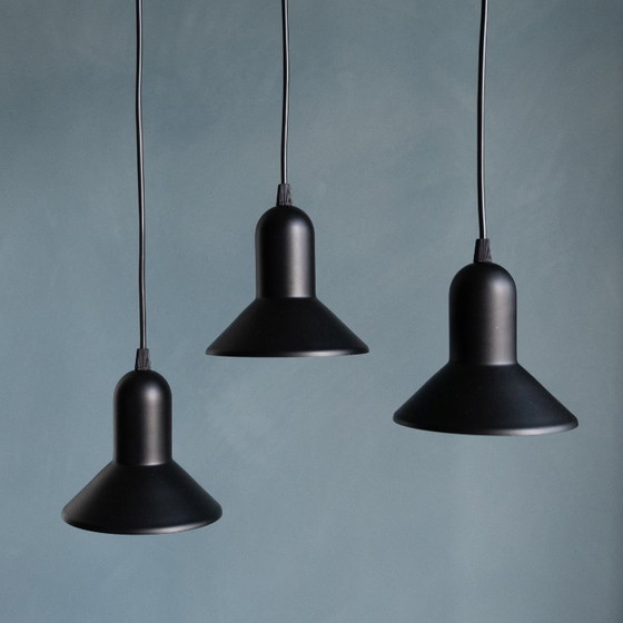Bellissimo set di tre piccole lampade a sospensione, disegnate dal duo di architetti danesi Claus Bonderup e Torsten Thorup. Il design risale agli anni '70 e fa parte di una serie di lampade dalle forme geometriche create da questi designer.