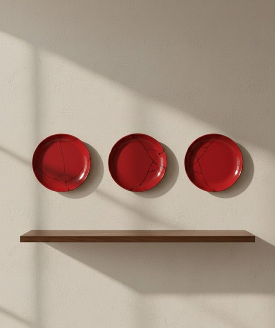 Questa esclusiva opera d'arte da parete presenta tre piatti in ceramica restaurati secondo l'antica arte giapponese del Kintsugi. Tecnica: Realizzata esclusivamente con lacca naturale urushi (100% priva di resine epossidiche).