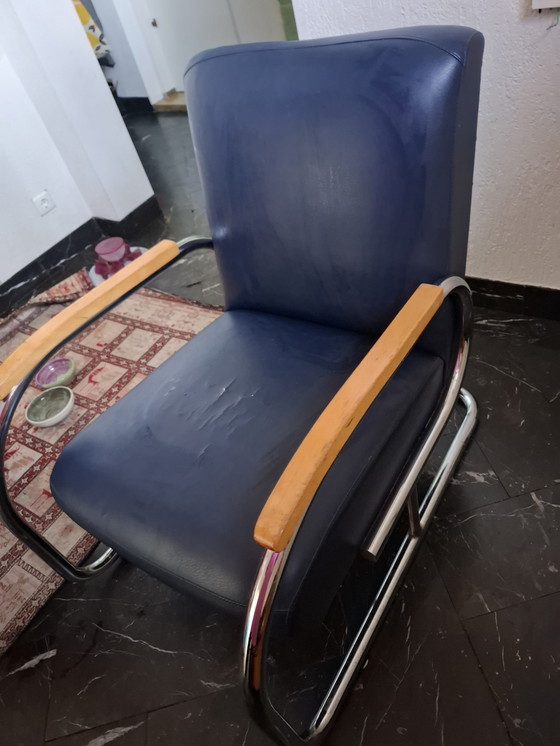 - Realizzata in pregiata pelle blu, con una robusta struttura in metallo e braccioli in legno.