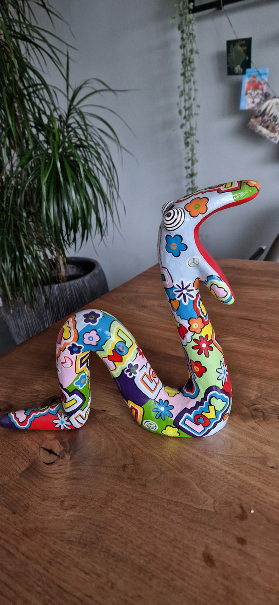Questo serpente colorato di Niloc Pagen è un vero colpo d'occhio. Con le sue forme giocose e i colori vivaci, porta un'atmosfera allegra in qualsiasi stanza. Perfetto per gli amanti dell'arte moderna e pop. Aggiungi un tocco di creatività ai tuoi interni con questo oggetto decorativo unico.