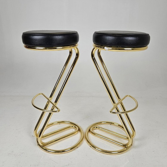Elevate your interior with these exquisite bar stools, where modern design meets timeless elegance. The sleek black leather seats provide a luxurious touch, perfectly complemented by the gleaming gold metal frames, creating a striking visual contrast that enhances any space.