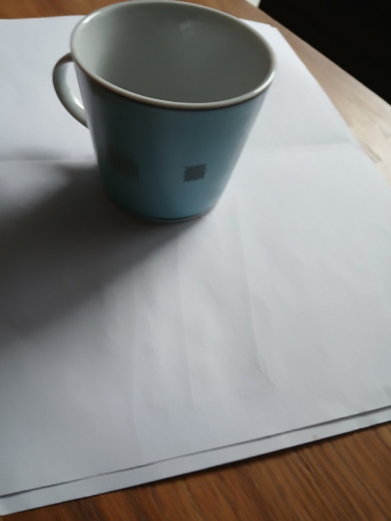 Set di 6 tazze da caffè del noto marchio Deken & Zn. Le tazze sono di colore azzurro con un design retrò. Sono lavabili in lavastoviglie e in microonde, come indicato sul fondo. Perfette per l'uso quotidiano o come aggiunta alle vostre stoviglie vintage.