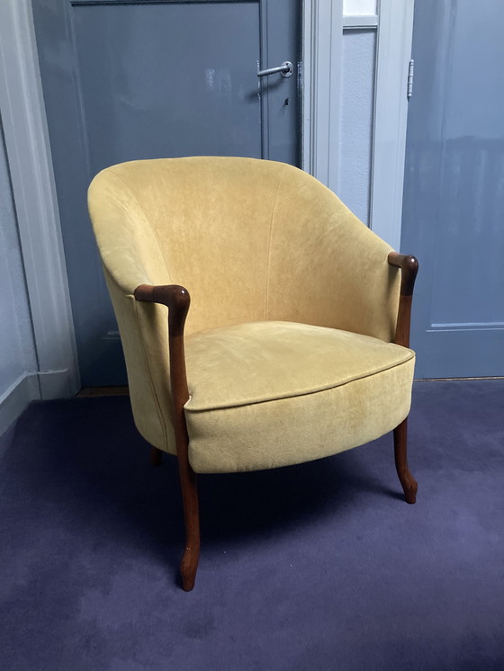 - Realizzata con un lussuoso rivestimento in velluto in una calda tonalità di giallo, questa sedia emana un senso di comfort raffinato.