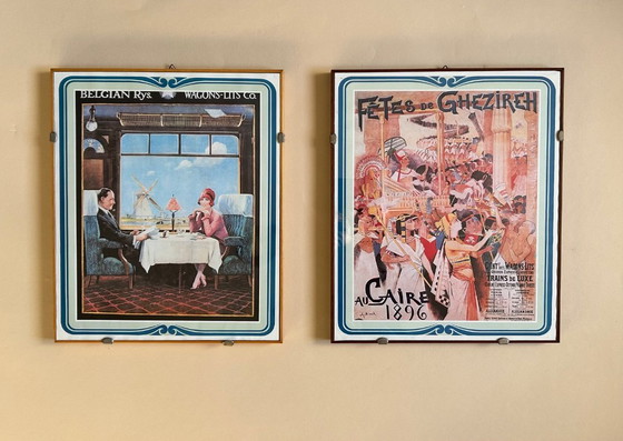 Immergiti nel fascino del passato con questo set di due stampe pubblicitarie vintage delle ferrovie. Queste opere d'arte evocano l'eleganza e il romanticismo dei viaggi in treno di un tempo. La prima stampa raffigurante una scena raffinata all'interno di un vagone ristorante, con un paesaggio olandese visibile dalla finestra. La seconda stampa celebra un evento storico al Cairo nel 1896, con un vivace corteo di figure in abiti tradizionali egiziani.