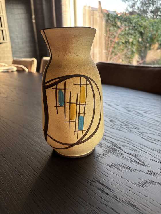 Esalta il tuo arredamento con questo splendido vaso in ceramica, vera testimonianza del fascino e dell'eleganza del design vintage. Realizzato nella Germania Ovest, questo pezzo presenta una superficie beige decorata con motivi astratti in blu e giallo, offrendo un impatto visivo sorprendente che fonde perfettamente l'estetica senza tempo con quella contemporanea.