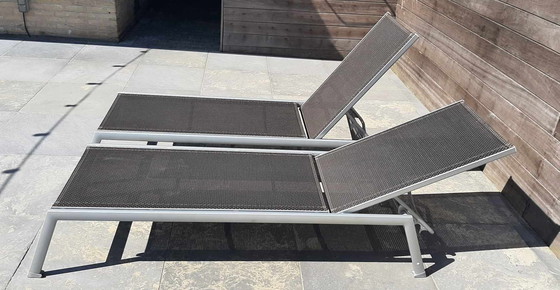 La collezione Victor di Varaschin comprende un lettino con struttura in alluminio verniciato a polvere, sedute e schienali in batyline o tessuto tecnico PVC coordinato alla struttura. Lo schienale è regolabile in altezza.