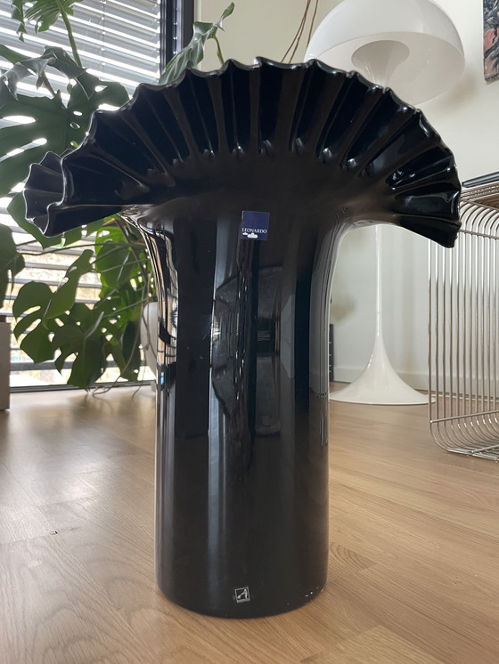 Un raro e bellissimo vaso a ventaglio nero di Leonardo. Presenta alcune macchie d'acqua e un'ammaccatura all'interno, sempre presente ma non particolarmente evidente. Se lucidato a dovere, il vaso probabilmente sembrerà nuovo.