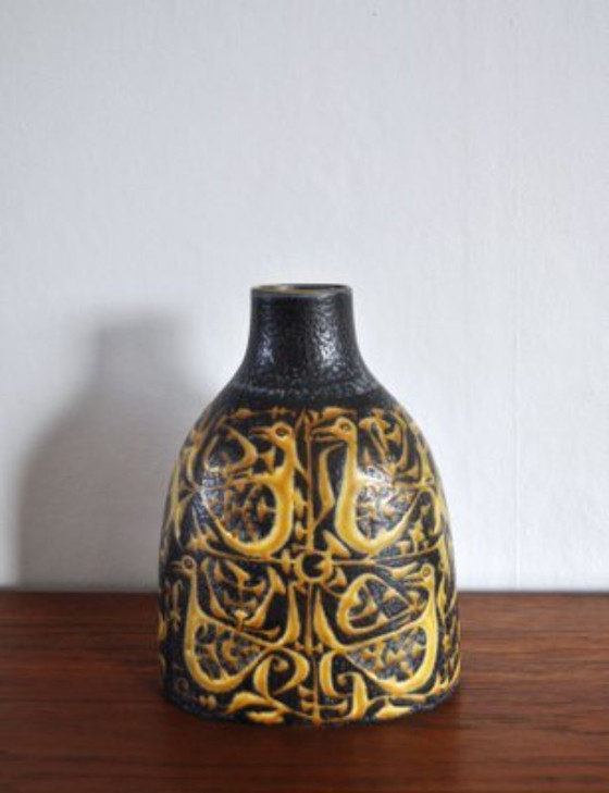 Scopri l'eleganza senza tempo di questo vaso antico disegnato da Nils Thorson per Royal Copenhagen. Con il suo sorprendente motivo nero e giallo e il raffinato stile Art Déco, questo vaso in ceramica aggiunge un tocco di raffinatezza a qualsiasi interno. Perfetto per esporre fiori o come opera d'arte a sé stante.