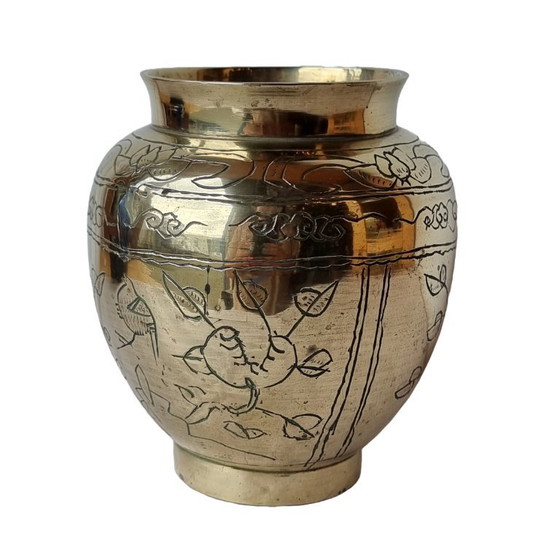 Questo vaso cinese di metà secolo in ottone è una vera e propria opera d'arte. Originario della metà del XX secolo e prodotto in Cina, questo vaso è completamente inciso a mano con una ricca decorazione di uccelli e fiori. Le linee sottili e l'incisione accurata sono veramente belle. Piccole macchie, come si vede nella foto, dovute all'età e al modo in cui è stato realizzato.