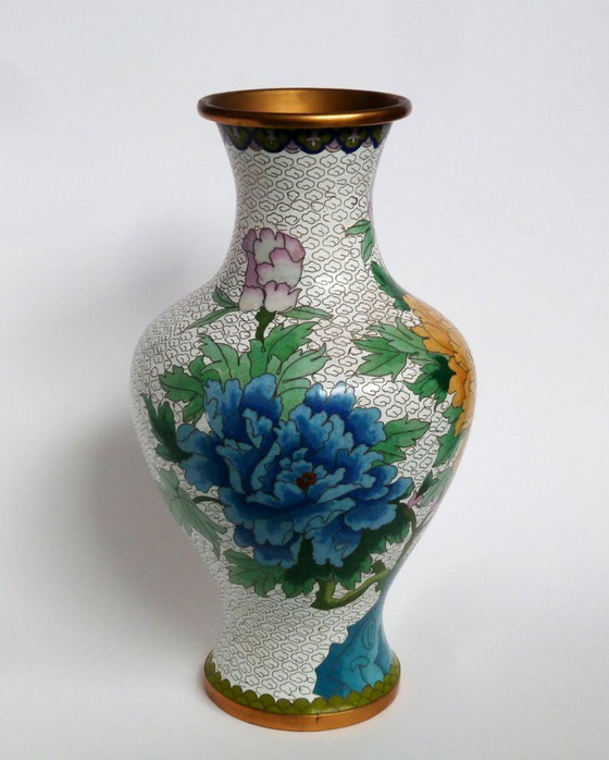 Bellissimo vaso cinese realizzato con la tecnica dello smalto cloisonné, decorato con motivi floreali e ornitologici. Presenta alcune piccole imperfezioni nello smalto (vedi foto), ma per il resto è in ottime condizioni. Questa tecnica è molto laboriosa e precisa, e il risultato è di grande pregio estetico.