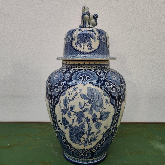 Questo imponente, grande vaso con coperchio è un autentico pezzo di ceramica d'epoca, prodotto dalla rinomata manifattura Petrus Regout & Co. (in seguito Royal Sphinx) di Maastricht. Realizzato nel classico stile Delftware, questo vaso presenta un ricco motivo floreale sino-indiano sormontato dall'iconico pomolo a forma di cane di Foo. Questo lo rende un magnifico pezzo da esposizione in stile cinese e un ricercato oggetto da collezione per gli amanti del design e dell'antiquariato olandese (circa anni '50-'60). Il vaso e il coperchio sono ancora in perfette condizioni!
