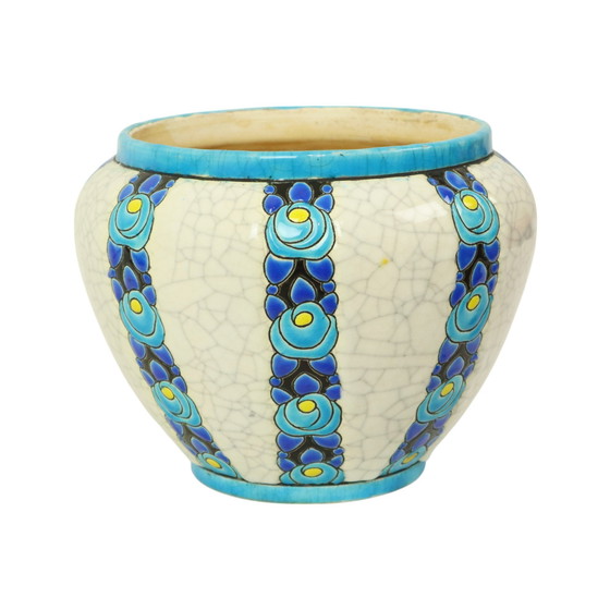 Questo vaso da fiori presenta un decoro policromo, un decoro floreale stilizzato a "rosette", un motivo geometrico blu e turchese su uno sfondo crepato color crema; questo oggetto è art déco in tutto e per tutto e ha un valore collezionistico molto elevato; i vasi sono molto più comuni di questo raro vaso da fiori o cache pot.