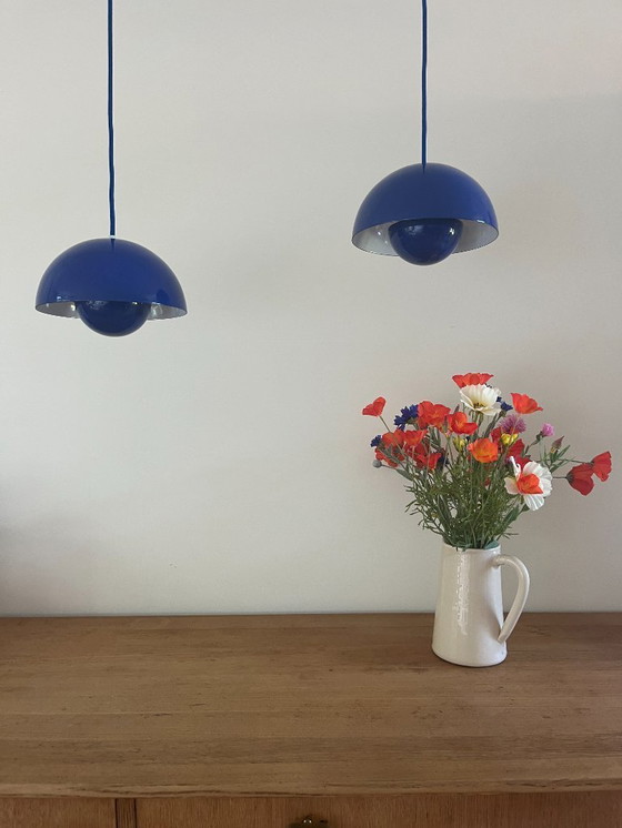 Questo è un set di 2 dell'iconica lampada Flowerpot di Verner Panton per Louis Poulsen, nella versione vintage in smalto. Il suo design giocoso e arrotondato e la finitura in smalto lucido la rendono un vero pezzo forte, perfetta come lampada a sospensione in soggiorno, sopra un tavolo da pranzo, un blocco cucina o in un angolo lettura.