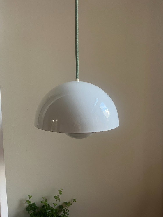 Questa è l'iconica lampada Flowerpot di Verner Panton per Louis Poulsen, nella versione vintage in smalto. Il suo design giocoso e arrotondato e la finitura in smalto lucido la rendono un vero pezzo forte, perfetta come lampada a sospensione in soggiorno, sopra un tavolo da pranzo, un blocco cucina o in un angolo lettura.