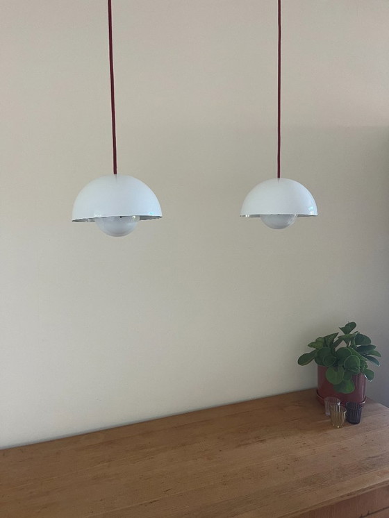 Questo è un set di 2 dell'iconica lampada Flowerpot di Verner Panton per Louis Poulsen, nella versione vintage in smalto. Il suo design giocoso e arrotondato e la finitura in smalto lucido la rendono un vero pezzo forte, perfetta come lampada a sospensione in soggiorno, sopra un tavolo da pranzo, un blocco cucina o in un angolo lettura.