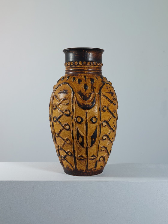 Questo imponente vaso da terra vintage della Bay Keramik, nella Germania Ovest, è un vero gioiello del Mid-Century Modern. Con il suo design distintivo e la palette di colori caldi e terrosi, cattura l'attenzione e aggiunge un tocco speciale a qualsiasi ambiente.