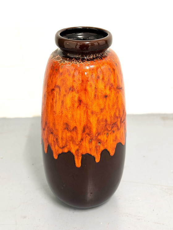 Questo vaso Fat Lava è stato realizzato da Scheurich nella Germania Ovest negli anni '70. Il vaso è marrone e presenta una smaltatura Fat Lava rosso-arancio. Marcato 284-47.